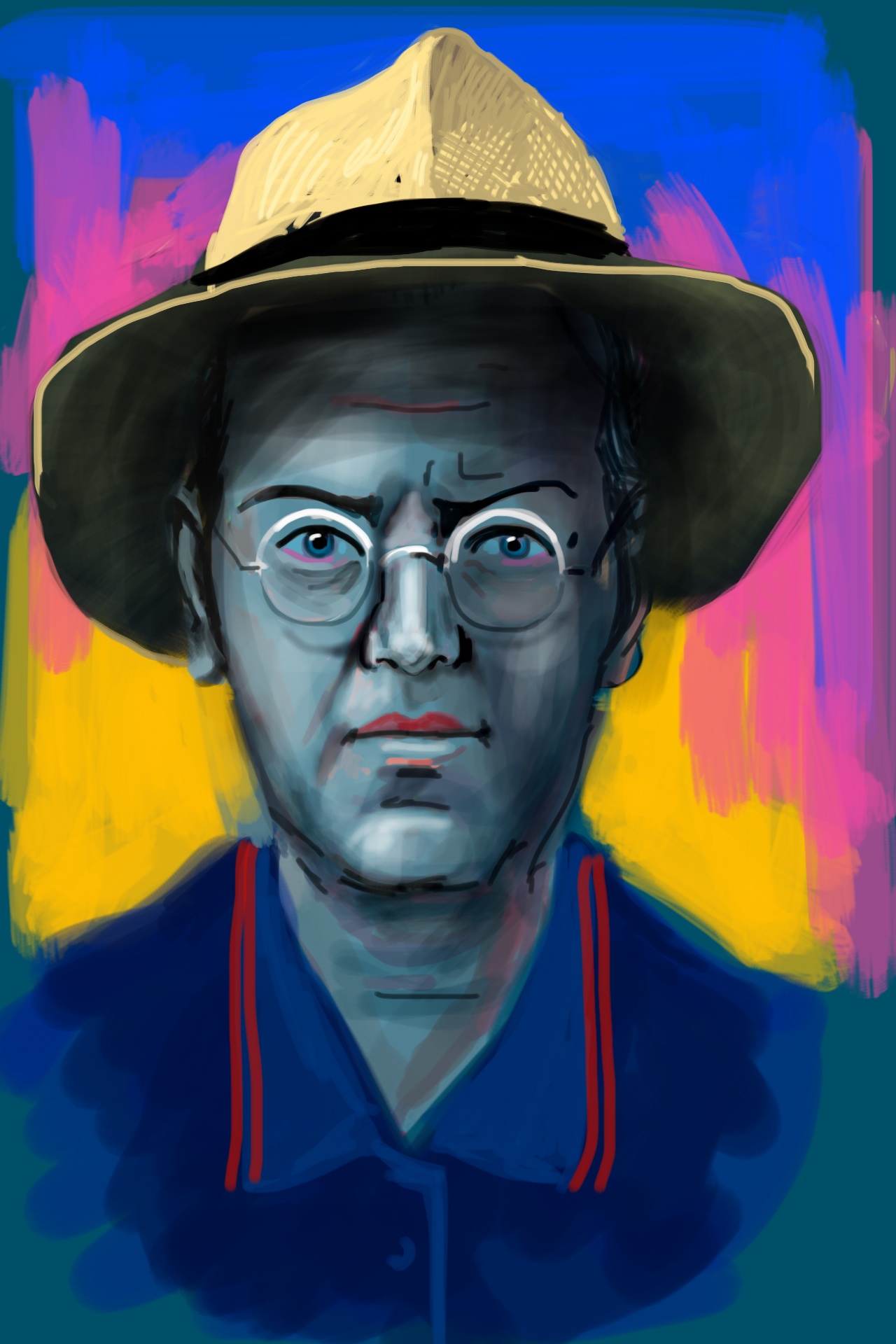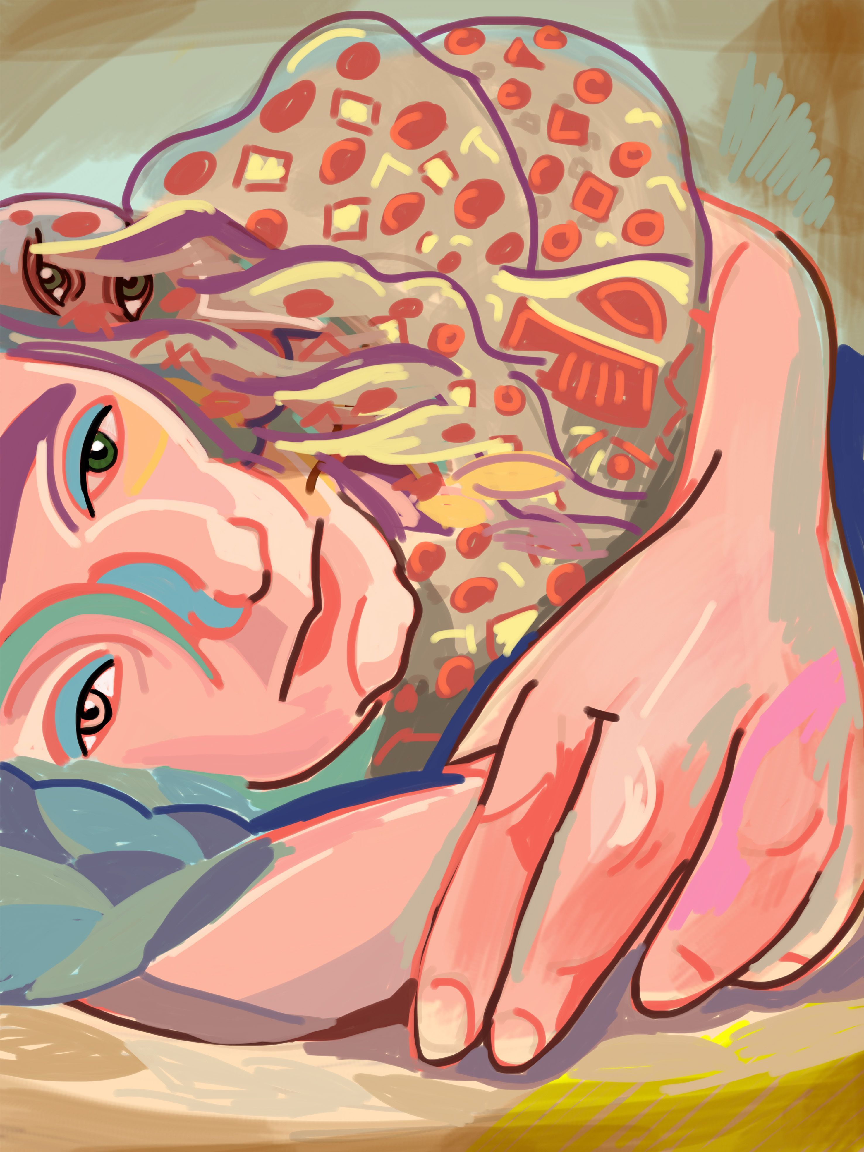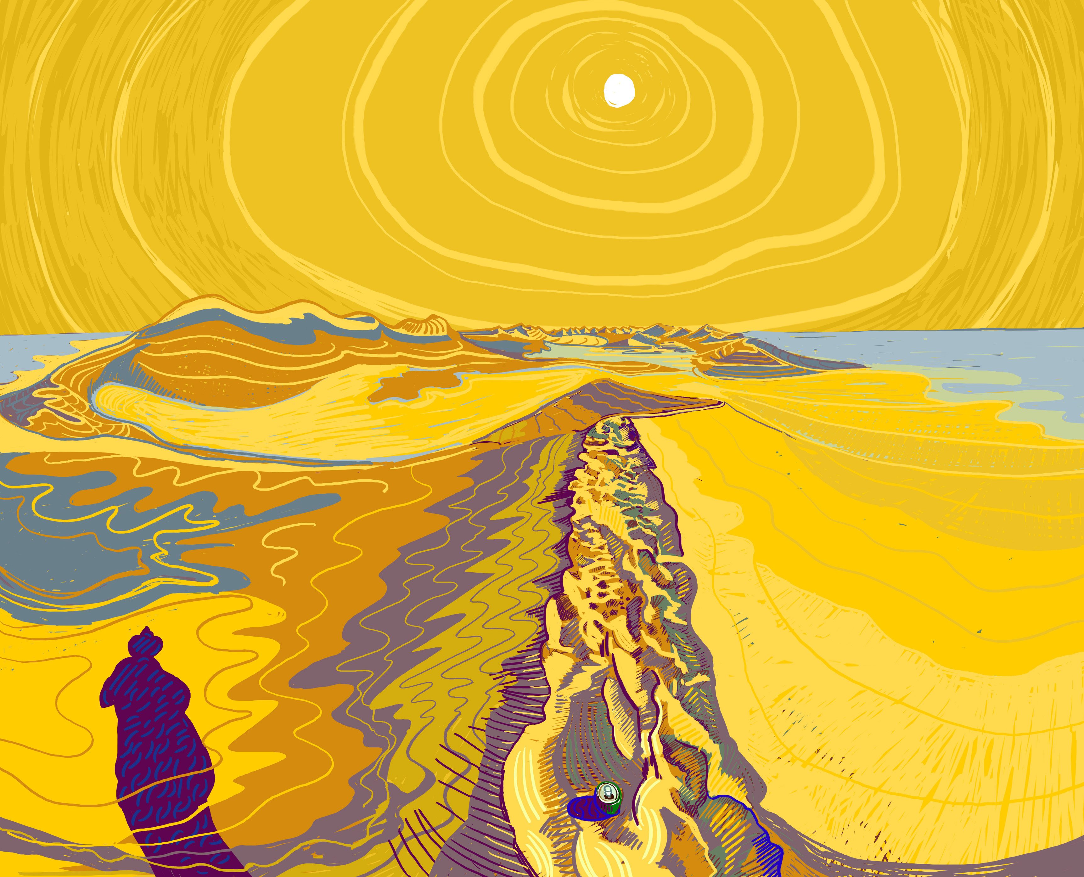 The success of these landscapes, still lifes, portraits, self-portraits, and interiors executed in France, Namibia, India and Finland is built on the experience gained from many years of working with traditional media. While Ijäs is a skilled draftsman, he is anything but a traditionalist. Using digital media enables him to work quickly and directly in his chosen landscape or setting. The device’s portability allows him to capture the exact quality of a mid-day, sunlit landscape viewed from a hilltop in Namibia’s remote Damaraland, as he does in Ugab River. I’ve had the privilege of watching Ijäs work on such plein air drawings in the Namibian desert and was surprised at how unexpectedly tactile the process of building an image is for him. It is most akin to finger painting, but with a near-infinite variety of colors, line thicknesses, and line qualities. He can apply color with any one of a vast number of tools, and erase, edit, and revise the works just as easily.