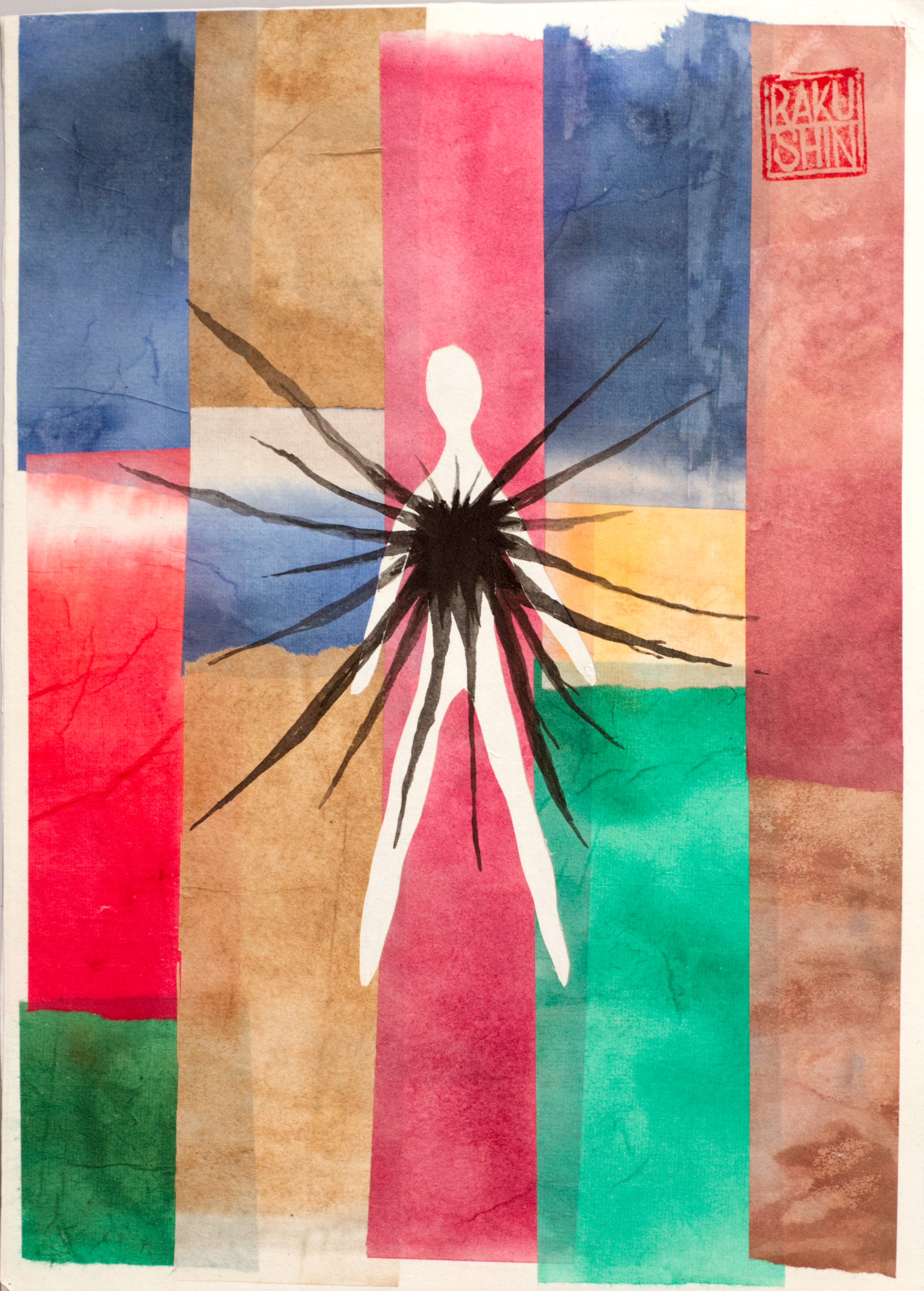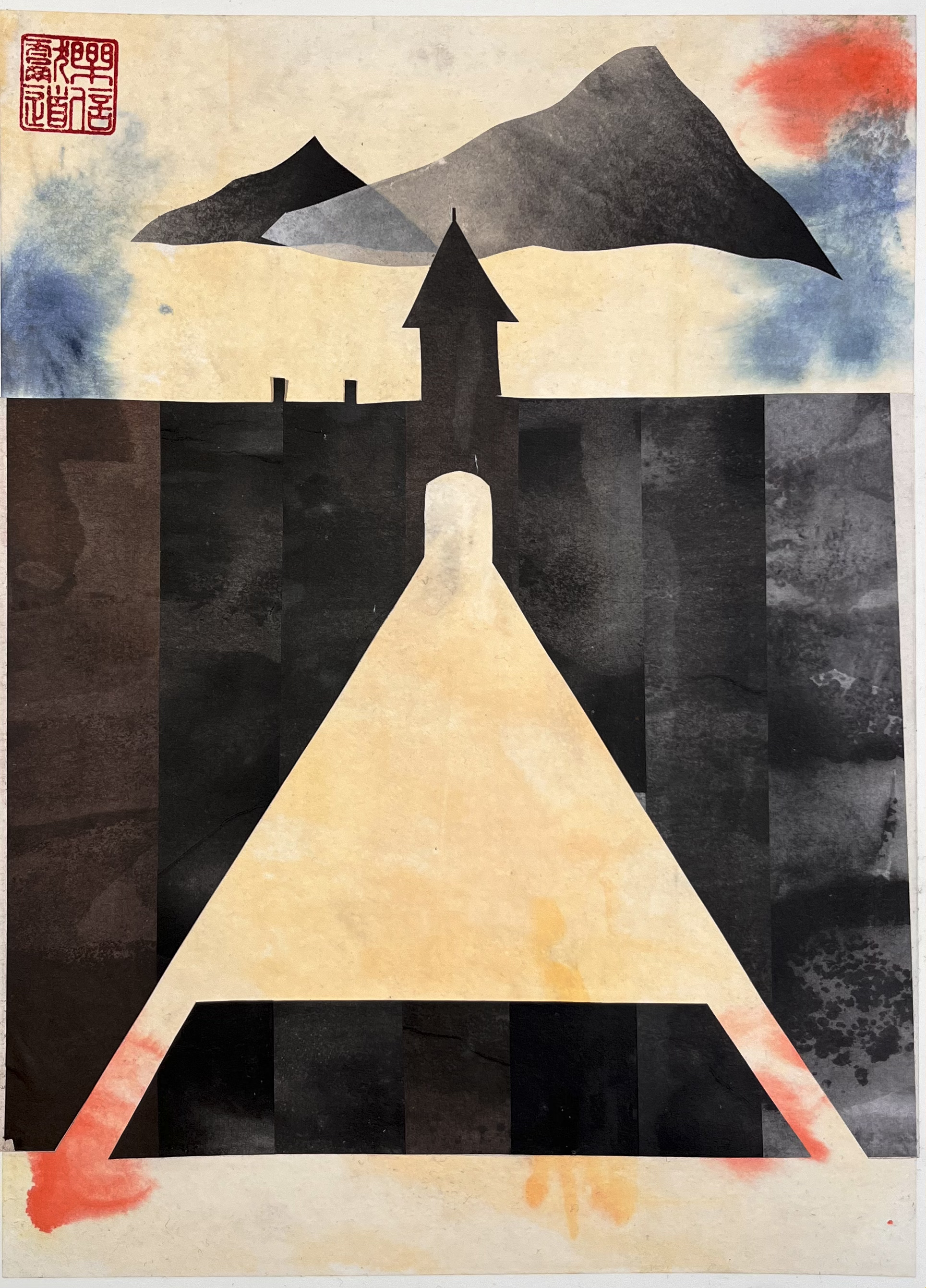 Japanese ink and water-colour. Rice paper collage mounted on rice paper