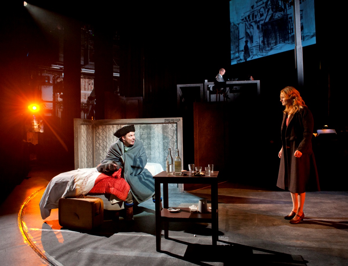 Estonian guerrilla (Janne Hyytiänienen, left) pays a visit to Juudit (Matleena Kuusniemi); simultaneously in the background, Edgar (Timo Tuominen) is bysy falsifying history. Photo by Stefan Bremer